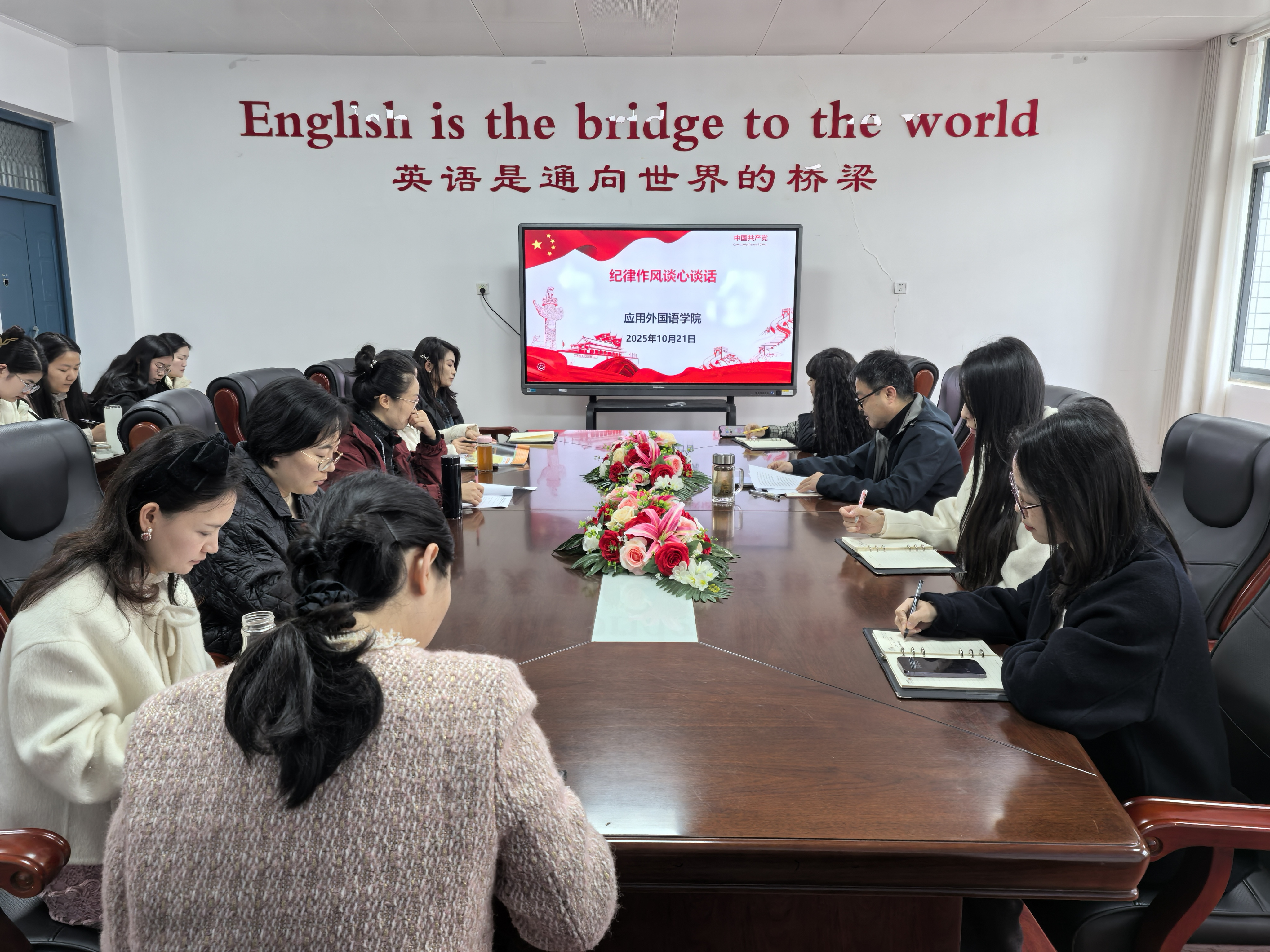 为深入贯彻落实学校党委关于开展“纪律规矩教育月”及“青年知廉”警示教育活动的统一部署要求,切实增强学院党员干部及青年教师的纪律意识、规矩意识和廉洁自律能力, 2025年10月22日,应用外国语学院在2406会议室组织召开“面对面”纪律作风谈心谈话会。学院党总支书记徐昊与教研室负责人、青年教师代表进行了集体谈心谈话。