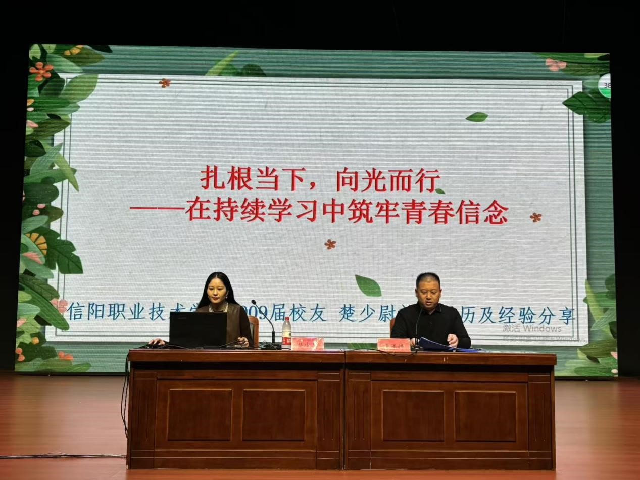 活动伊始,张泽锋对楚少尉校友的返校表示热烈欢迎,并做简要介绍,为报告会营造良好氛围。报告中,楚少尉跳出抽象说教,以自身经历为蓝本,将“扎根”与“向光”转化为可感知的故事:从大学期间的坚持,到职场上从基础岗位做起的沉淀;从行业学习的突破,到遭遇挫折时调整心态的坚韧。真实经历让“脚踏实地”“保持热爱”等理念不再空洞,为学弟学妹们树立了可参照的成长标杆。其次,楚少尉结合自己的成长与突破直言“扎根是接受平凡,向光是拒绝平庸”。鼓励学弟学妹们保持学习热情,注重实践积累,为未来职业发展打下坚实基础。最后,张泽锋作总结,希望同学们始终保持心中的情怀与理想,在各自的专业领域努力拼搏,持续进步,不断超越。